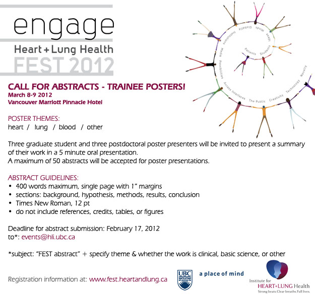 Have you submitted your poster abstract? Today is the 17th of February, meaning that it is time to send in your abstract in order to meet the deadline and showcase your work at FEST 2012. The Poster Session is an incredible opportunity for all trainees/students to present their research to the greater science community. Improve your oral presentation skills and connect with experts in your chosen field of study. Email [email protected] and be sure to attach your abstract. Label your e-mail clearly by making subject line read as follows: “Fest abstract” + specify theme and whether the work is clinical, basic science, or other.